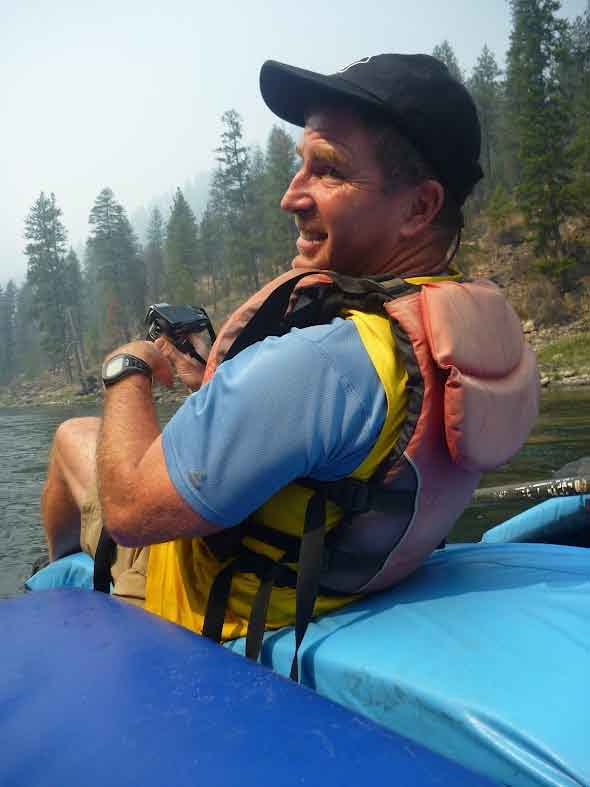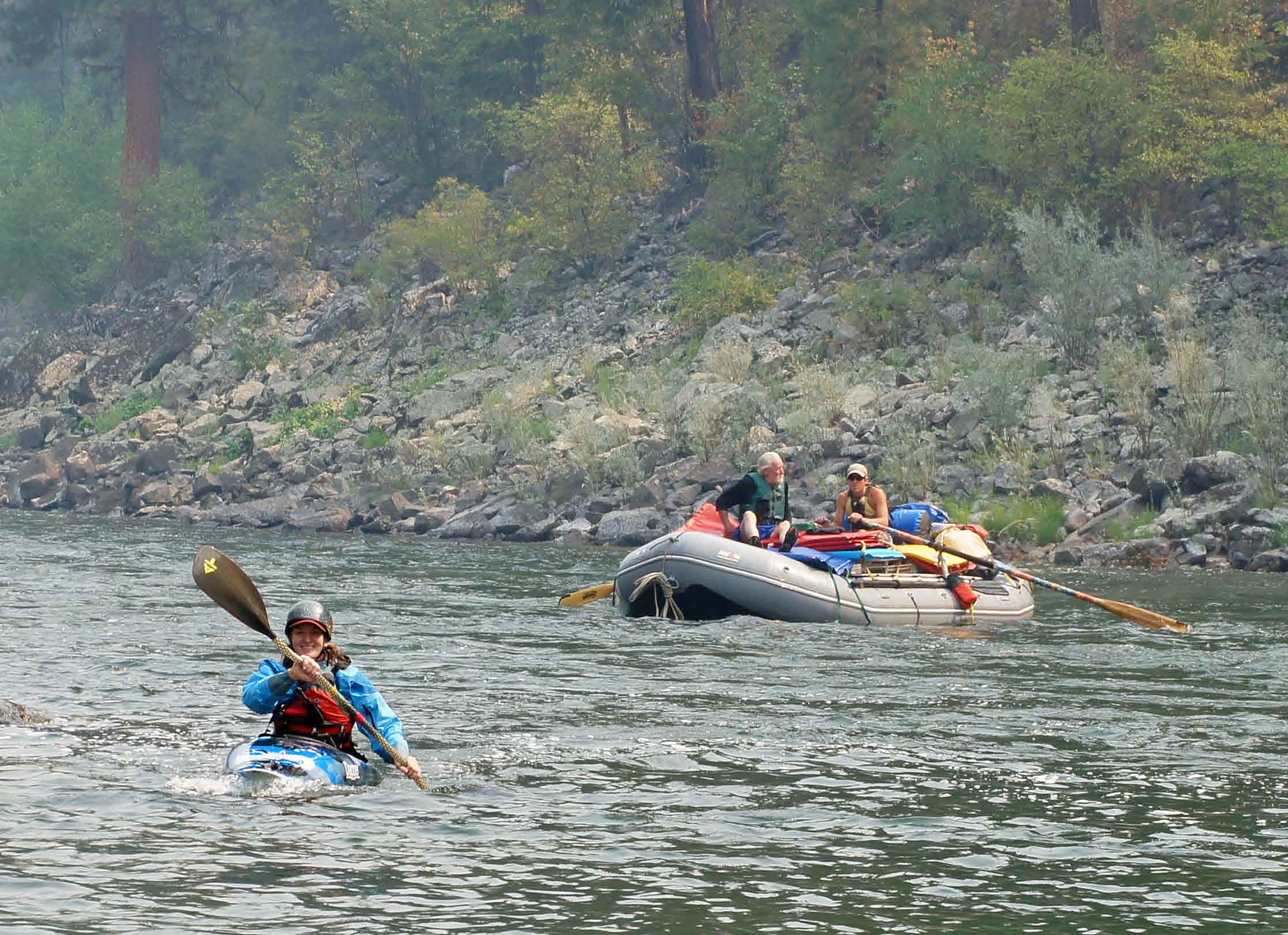 Forest fires and thick smoke surround us as we drive to the put-in on the Middle Salmon River. We are escorted by a fire crew in a truck with flashing lights. It remained smokey in places during the first day and a half of the trip. We finally left the forest fires behind for the most part, and had clear days to float. Ocassionally, depending on the direction of the wind, the smoke would blow back in for a while.