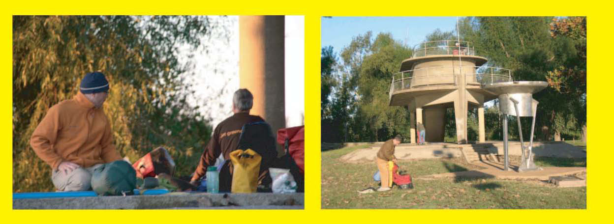 < Last night's drive down to the Confluence wasn't as bad as I had thought, and the park at Ft. Defiance was pretty nice. It wasn't filled with broken bottles and cans as is sometimes the case. In fact, it had this interesting three level pavillion/observation deck, which we chose to sleep on, under, or around.