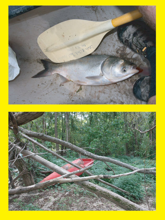 << Ralph and I were paddling between the river bank and a barge tow. The barge tow scared a couple of fish, one of which jumped into my lap and then flopped onto the floor of the canoe.